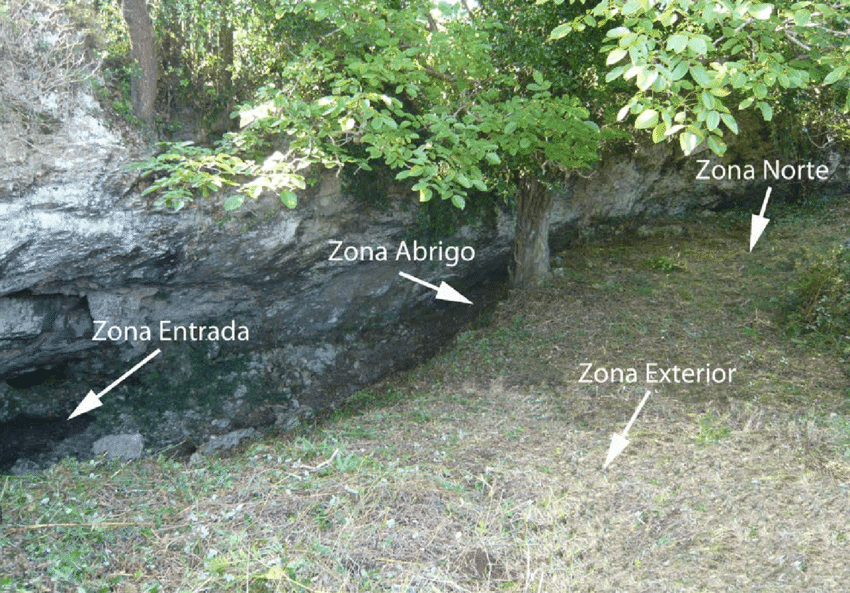 Vista general del abrigo antes de iniciarse el proyecto con indicación de las zonas de excavación, en la ‘Cueva del Mazo’