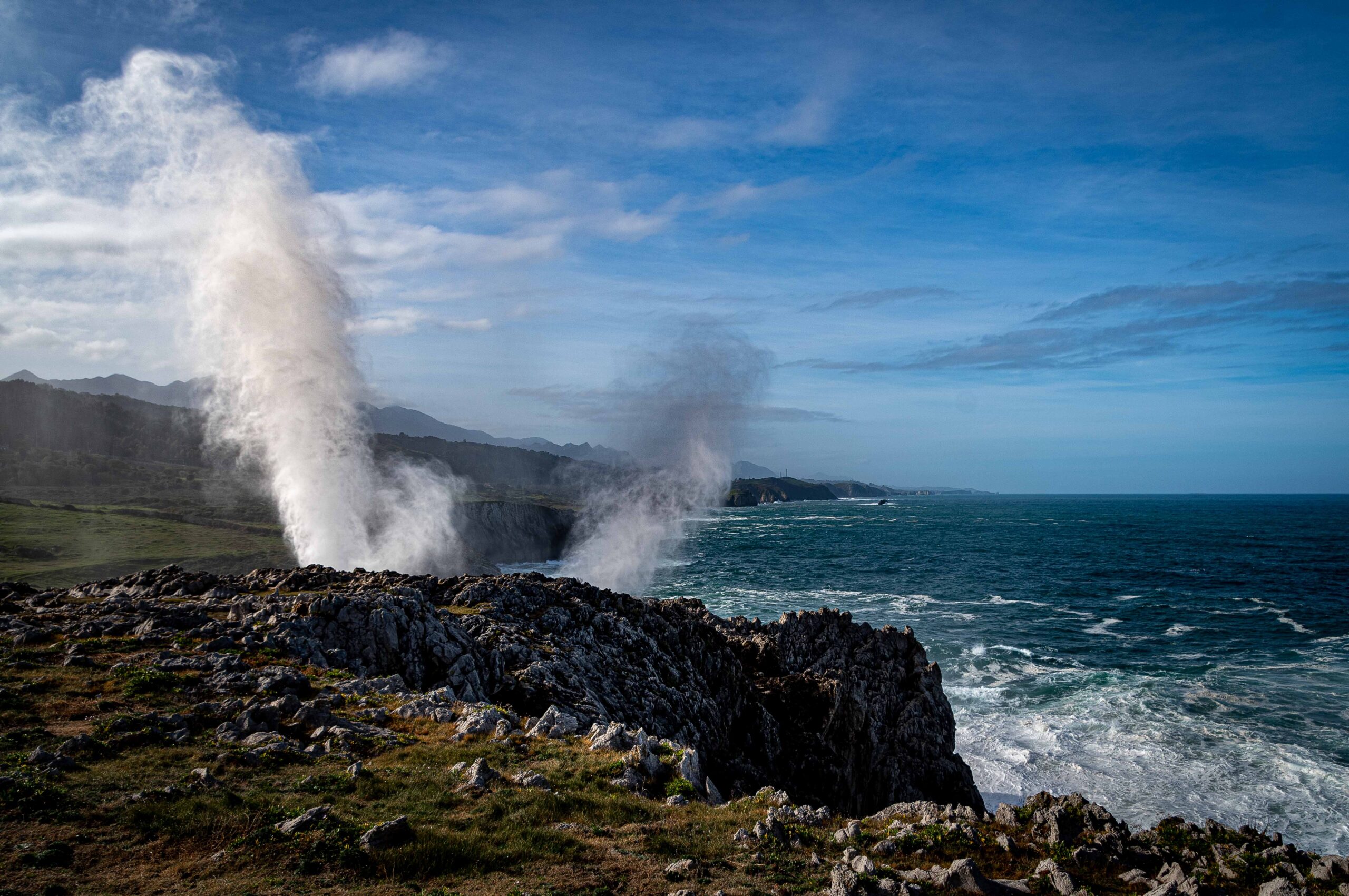 En realidad, nosotros íbamos a hacer fotos a la playa de la Franca, que se encuentra en las cercanías, cuando de pronto desde la carretera me percaté de que el bufón considerado el mayor del Concejo, su chorro puede llegar a alcanzar los 40 metros de altura, estaba activo.
