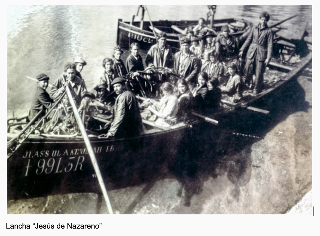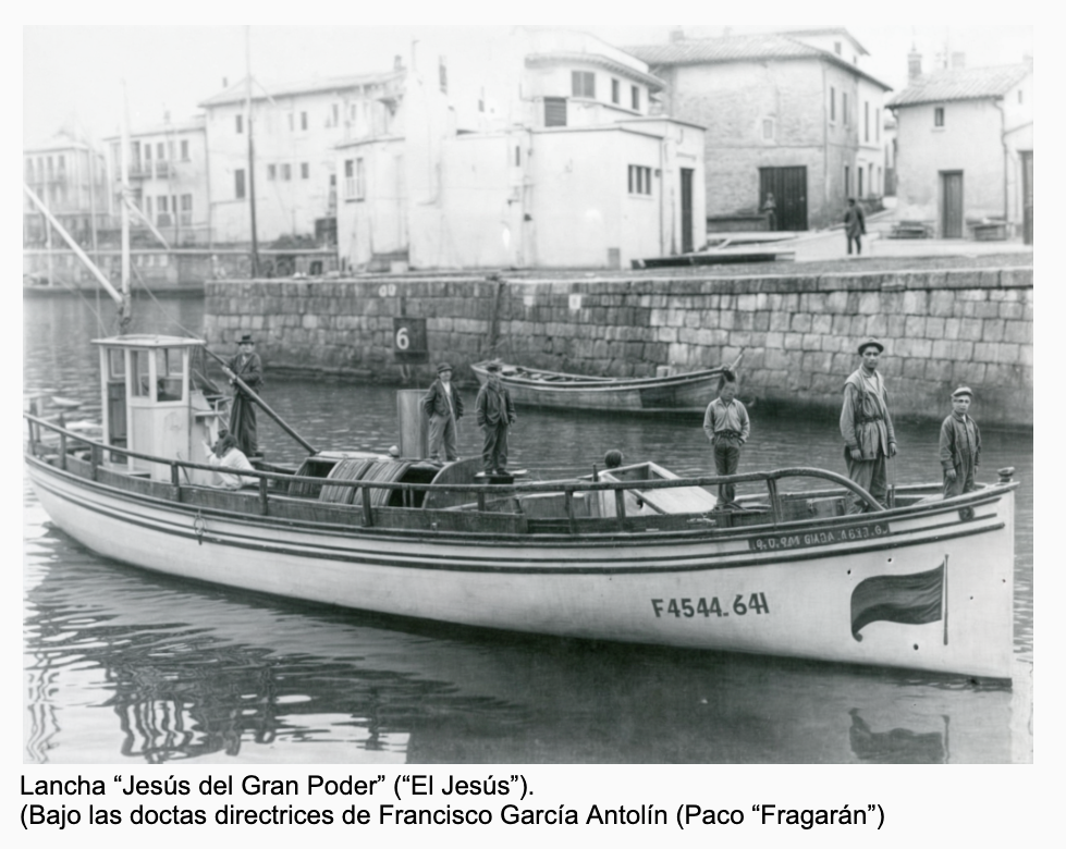 -F: Nos estamos refiriendo al “Jesús del Gran Poder” (El “Jesús”), que según la Dirección Local de Navegación y Pesca Marítima de Ribadesella, en su folio nº 134, lista 3ª, y en el Año de Inscripción 1933, nos dice que se trata de una motora de casco de madera, construida en Santoña en el Año de Gracia de 1932, que tenía una eslora de 6,75 m., una manga de 2,45 m. y un puntal de 1,35 m., desplazando 4,73 toneladas, y que siendo abanderada el 16 de Enero de 1933, por su propietario y armador, don Adolfo García del Cueto, fue valorada en la friolera de 40.500,- Ptas. “una por encima de otra”