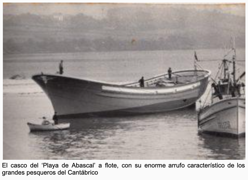 En esta serie de fotografías, que amablemente me cedió “Tisto”, vemos al “Playa de Abascal”, durante su prueba de flotabilidad, donde se contempla el pronunciado arrufo de su casco, típico de la construcción naval en los grandes pesqueros del Cantábrico. En otra ya a flote con su superestructura ya armada.