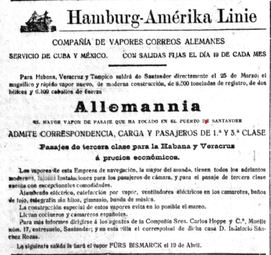 La mayor parte de los emigrantes españoles a América (en torno a los dos tercios del total) fueron transportados por navieras extranjeras, entre ella estaba Hamburg-Amerika Linie, empresa que se estableció en la ciudad alemana de Hamburgo en 1847 y cuyo objeto era el transporte de personas y mercancías a lo largo del océano Atlántico.