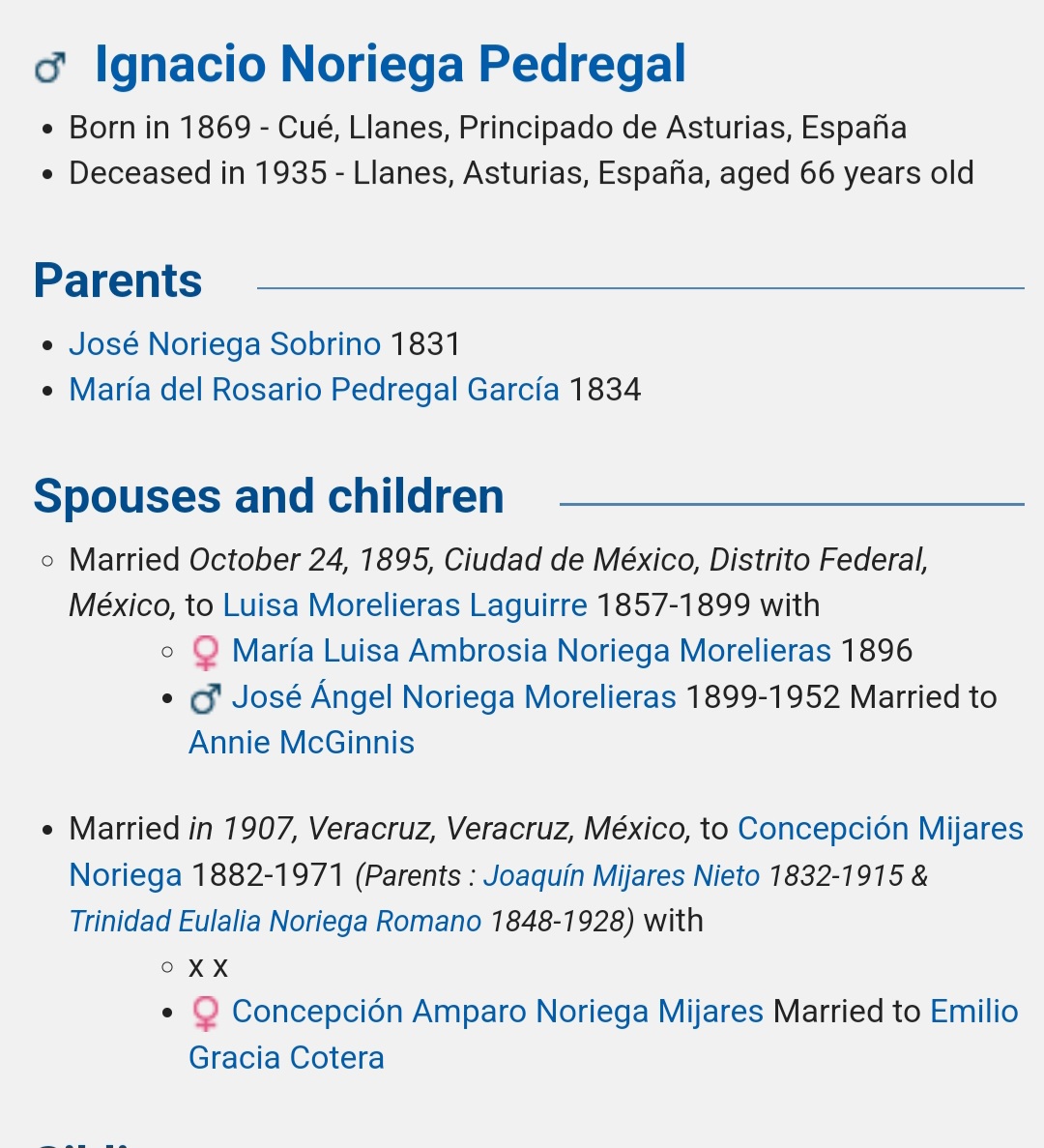 Ignacio, natural de Cue, nació en 1869 y falleció en Llanes en 1935. Era hijo de José Noriega Sobrino y María del Rosario Pedregal García. Muy joven emigró a México, donde hizo una gran fortuna con un negocio de importación de vajillas y cristalerías alemanas. Corriendo el año 1895 se casó en la capital mexicana con Luisa Morelieras Laguirre, con la que tuvo dos hijos, una niña, María Luisa, y un niño, José Ángel. Ocho años después del fallecimiento de su primera esposa, contrajo segundas nupcias en la ciudad de Veracruz con Concepción Mijares Noriega. Ignacio y Conchita fueron padres de un hijo, Ignacio, y una hija, Concepción Amparo, la cual se casó con Emilio Gracia Cotera, y de dicho matrimonio nacieron dos hijos, José Ignacio y Emilio. El primero fue un prolífico escritor, periodista y cronista oficial de Llanes, con más de 40 libros editados y numerosas obras inéditas de variadas disciplinas, así como cientos de artículos de prensa, la mayoría de ellos publicados en “La Nueva España”. Además fue el ganador en el año 1987 del prestigioso premio “Tigre Juan”.