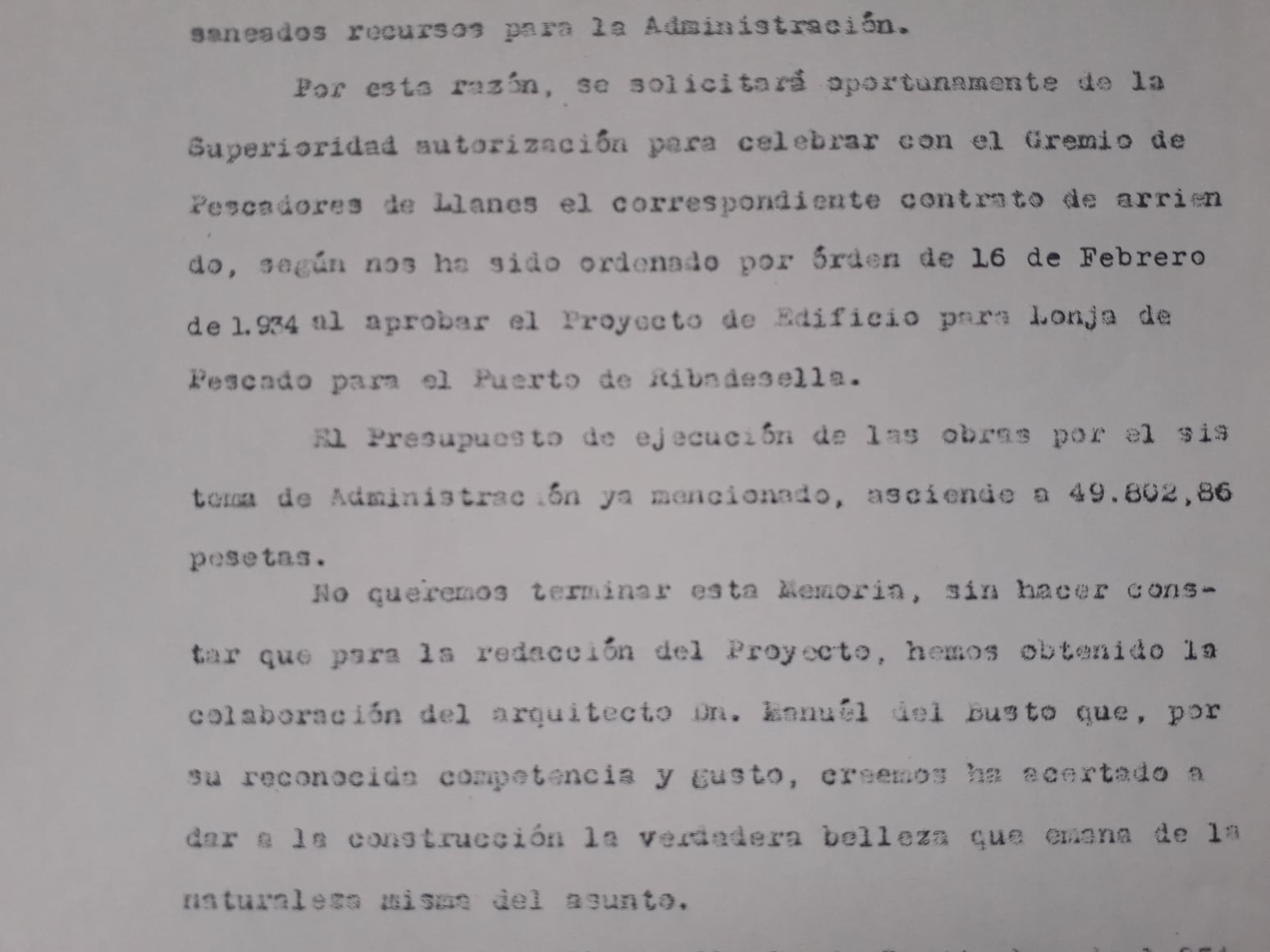 Se incluyen cuatro fotografías de la Lonja del Pescado de Llanes levantada en 1934. Son obra del fotógrafo Valentín Orejas. Y también se acompaña una fotografía del documento en el que el ingeniero Aguirre atribuye la redacción del Proyecto al arquitecto Manuel del Busto. Saludos cordiales. Y lo dicho, los documentos están a disposición de quien quiera consultarlos.