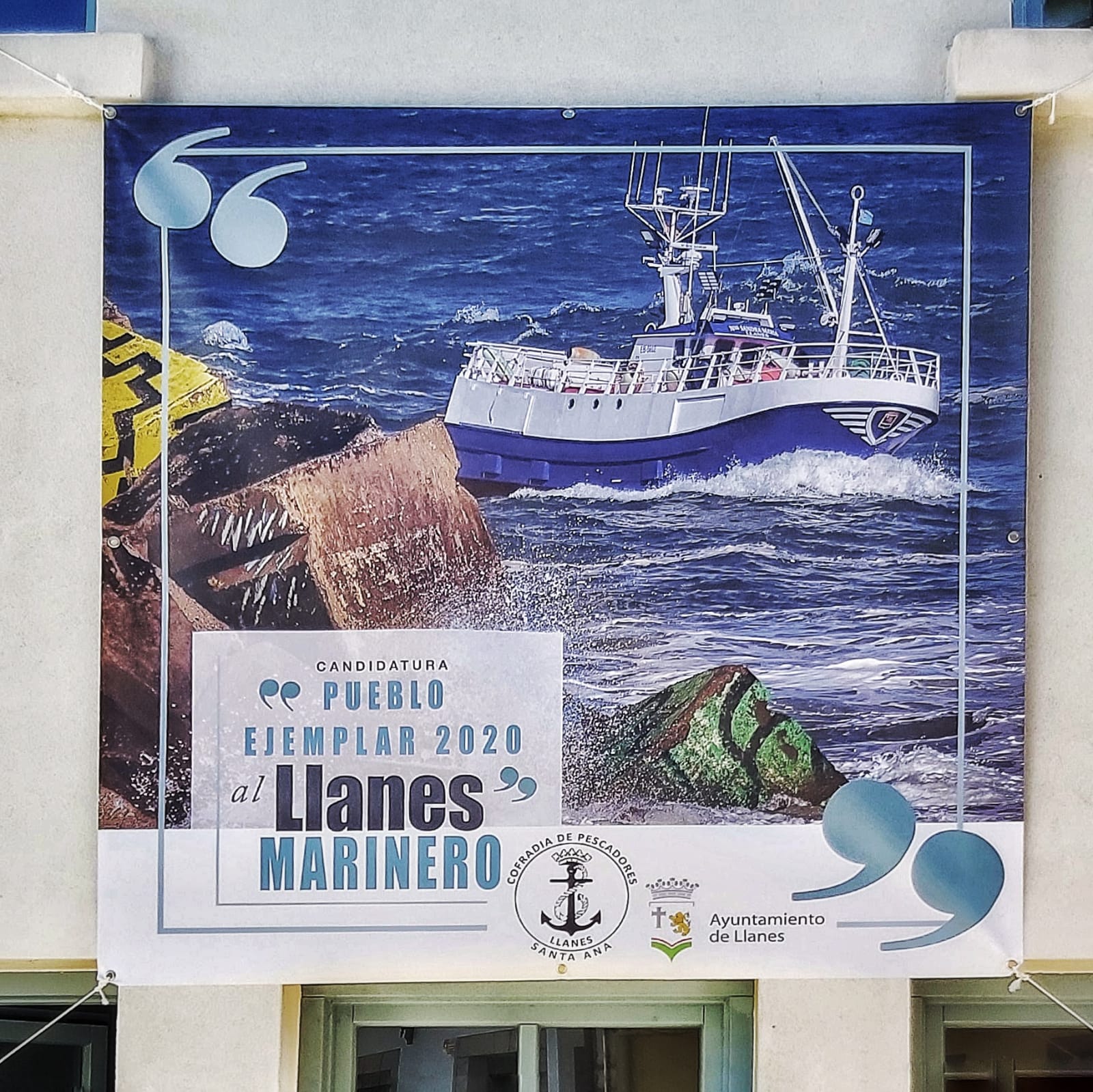Coincidiendo con la cuenta atrás, se han desplegado en la rula vieja (actual oficina de turismo) y en la fachada del ayuntamiento unas banderolas de apoyo al “Llanes más marinero” con la imagen, en primer plano, de un barco entrando a puerto y como protagonista principal el intenso azul del mar.