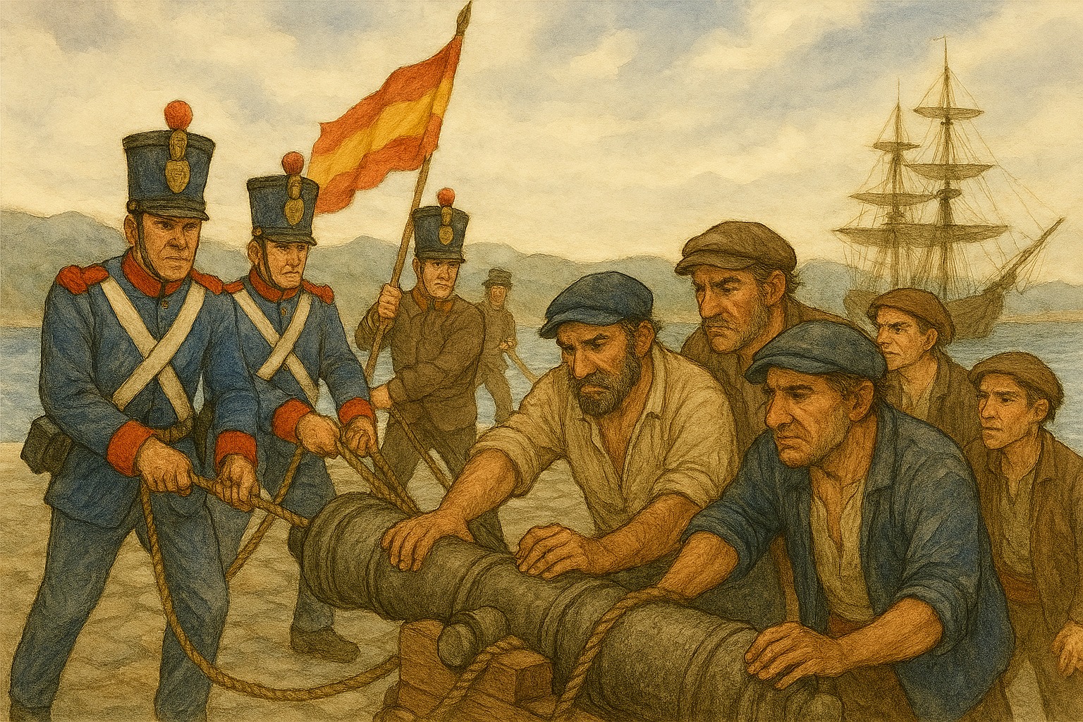 Pero a lo que yo quería llegar es a que, según relata Fernando Carrera en un libro editado por “El Oriente de Asturias”, en 1834 vino a Llanes un pelotón de artilleros a recoger armas y desartillar el Fuerte, llevándose cuatro cañones de a cuatro. Pero al querer arrancar otro cañón que servía de amarre en la cabeza del muelle, se amotinaron los marineros llaniscos provocando una colisión.