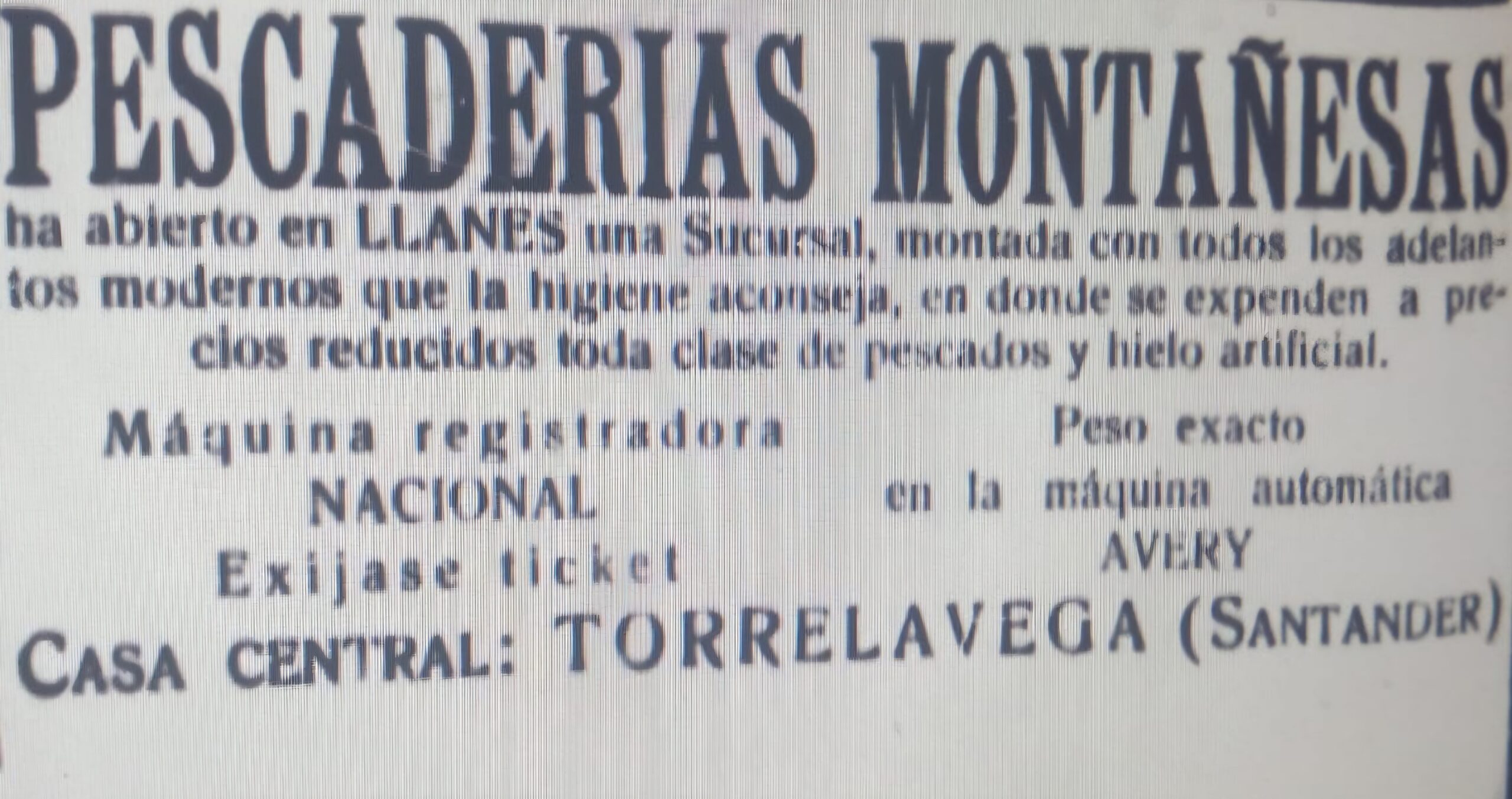 Según se recoge, en un anuncio de “El Pueblo”, aquel negocio estaba montado con todos los adelantos modernos que la higiene aconsejaba. Además de expender todo clase de pescados, ofrecía hielo artificial.