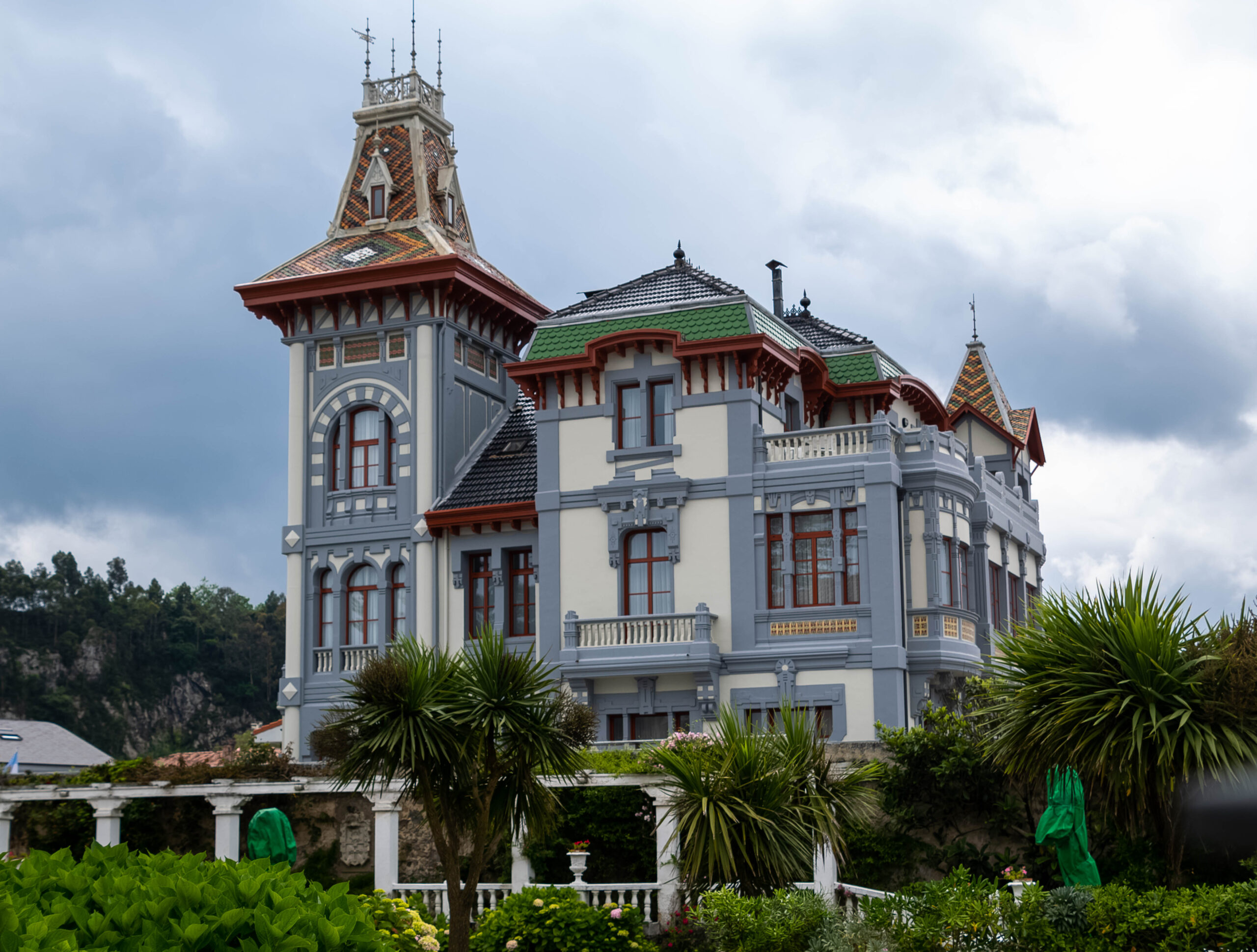En Villa Rosario, actualmente reconvertida en un hotel, te quedas sin miradas para las cubiertas amansardadas con aristas, las torres asimétricas, los balcones, uno de peineta en el porche y otro adintelado al nordeste, las galerías acristaladas, tan de este clima, y las terrazas, la mayor con balaustrada, de otros climas, sus exquisitos tonos azulados inspirados en el mar cantábrico, y las tejas vitrificadas, como escamas de colores brillando al sol.